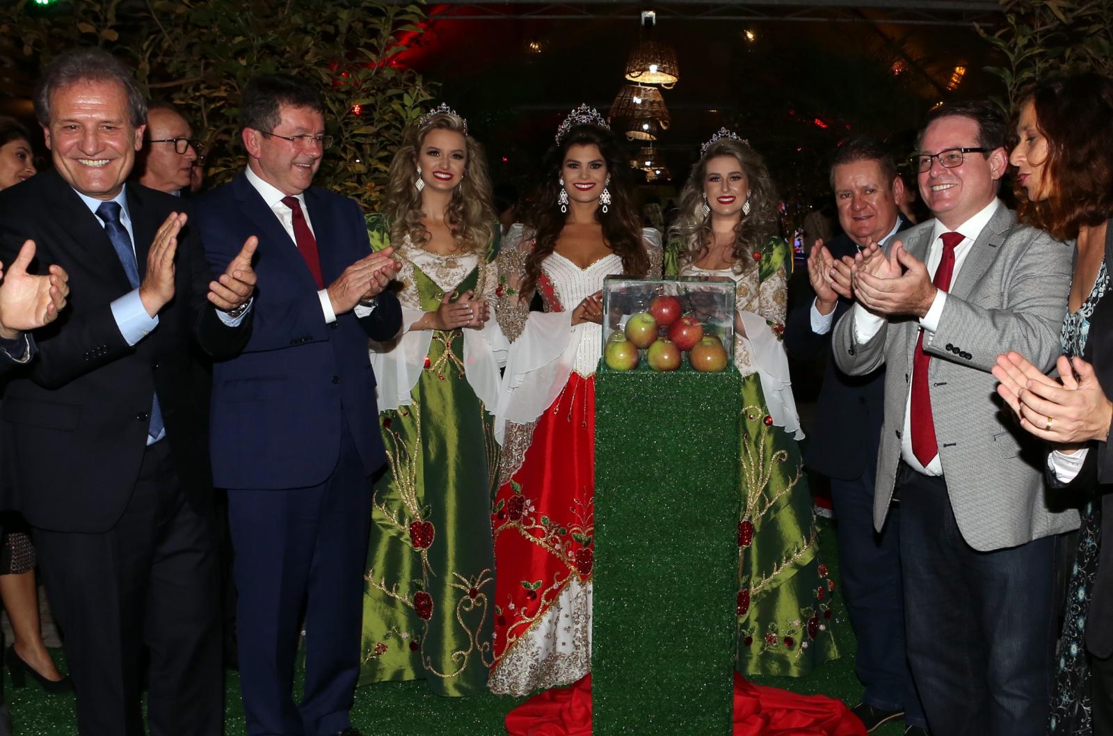 Legenda: Descerramento de totem com maçãs da variedade José Bin marcou a abertura da Femaçã. Na imagem, o presidente da festa, Domingos Costella; o prefeito de Veranópolis, Waldemr De Carli; as soberanas da X Femaçã, Bruna Zanotto, Fernanda Fracasso e Francine Bortoli; o vice-governador do RS, Ranolfo Vieira Júnior; o deputado federal Ronaldo Santini; e deputada estadual Sofia Cavedon.
